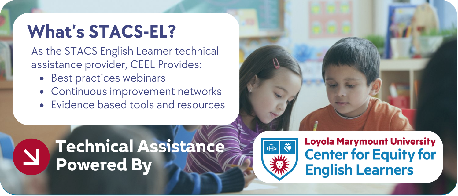 1 - Designing an Equitable and Evidence Based Comprehensive ELD Program | This webinar guides educational leaders through the essential components of a Comprehensive ELD Program and offers a synthesis of evidence‑based resources and tools to strengthen multilingual learner outcomes. Participants will also be introduced to CEEL as the Statewide English Learner Technical Assistance provider through the STACS subgrant. | Register Here |